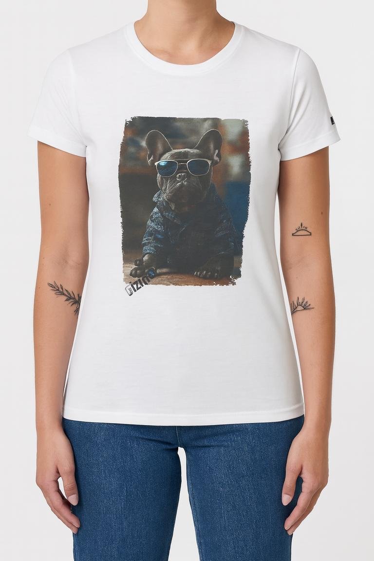 Premium streetwear heavy cotton woman tee featuring a bold Punky Frenchie illustration in white, black, and red. Unisex XS–XL, soft feel, built for city nights and loud days.